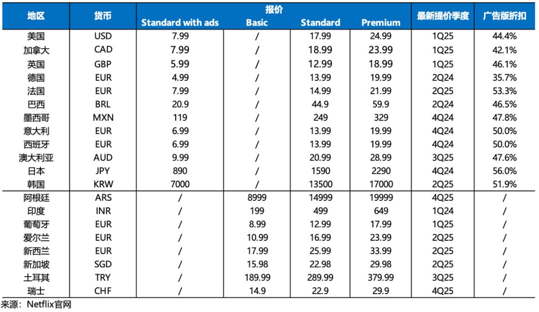 虽然过去一年,Netflix在国际地区(主要是亚洲)用户增长有良好势头,但无奈人均付费单价不足北美一半,因此短期增长还得靠在成熟市场的垄断优势下涨价。25年初北美、欧洲地区的陆续涨价,在四季度年末看到了明显的涨价效应。