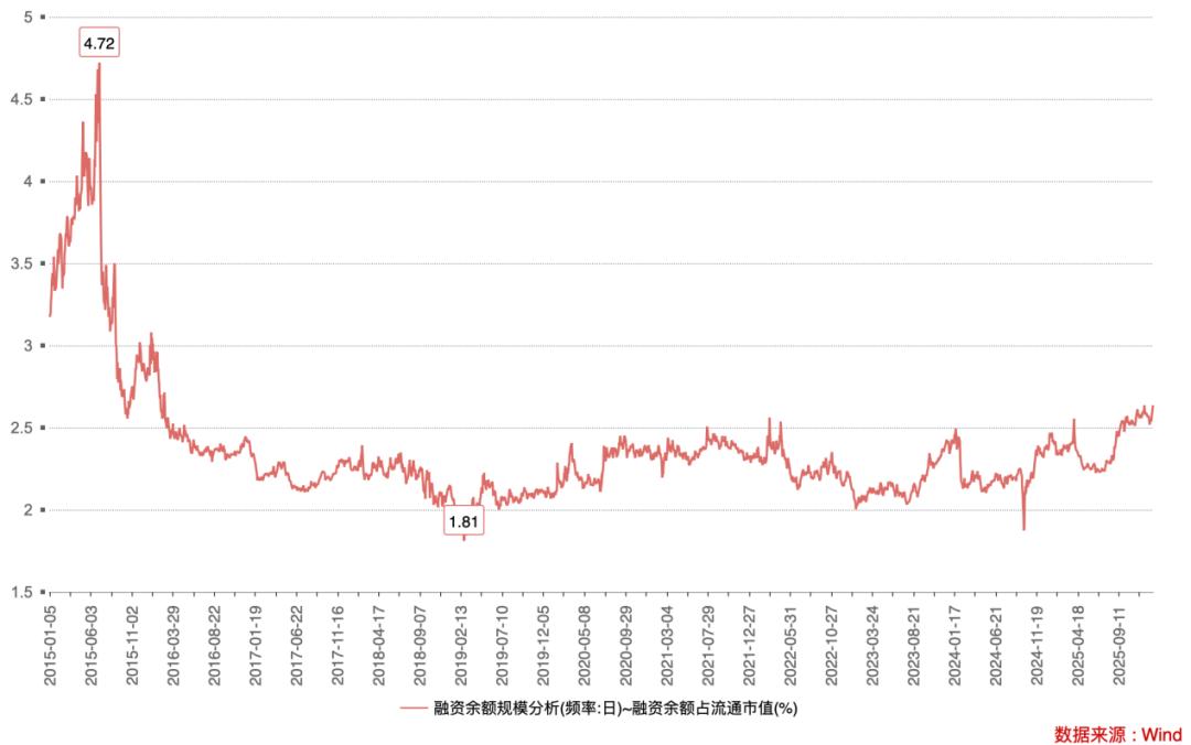 回顾历史走势,2015年A股市场杠杆牛市期间,这一指标曾创下4.72%的历史峰值,此后随着监管层对杠杆资金的规范引导,逐步回落并长期在2.00%-2.50%区间震荡。