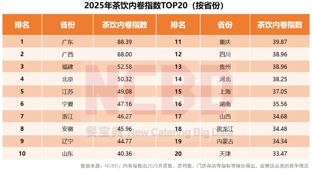 从《2026中国茶饮品类发展白皮书》的数据来看,广东凭借高门店密度、高企业聚集度、低存活率及核心城市门店收缩的双重压力,成为全国茶饮内卷最严重的省份,而“两广”及东南沿海省份的重点城市共同构成了行业内卷的核心地带。这场内卷本质上是行业发展到成熟阶段的必然结果,既是重点城市供需失衡的直接体现,也是市场倒逼品牌升级的催化剂。
