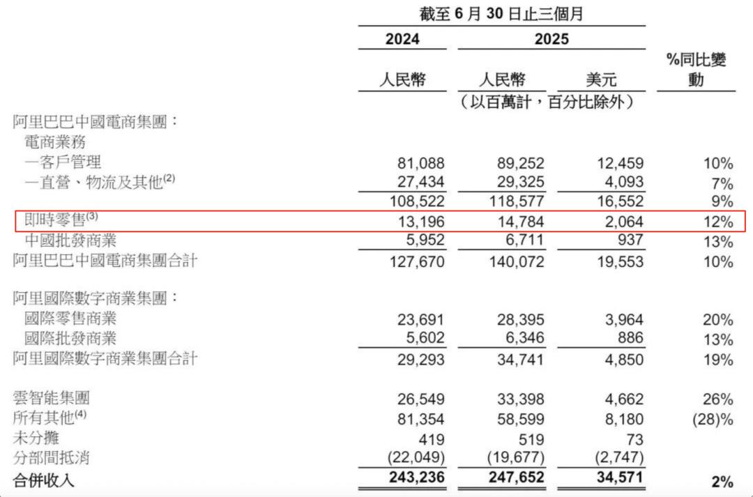 2025年二季度,阿里首次将饿了么归入中国电商集团即时零售板块核算,同期即时零售实现收入147.84亿元,同比增长12%,成为集团内少数保持双位数增长的业务板块。