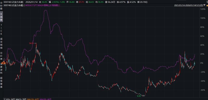 这种经营特性直接传导至资本市场,公司股价与稀土价格指数高度相关,底层逻辑本质是业绩预期随稀土价格的周期性调整。