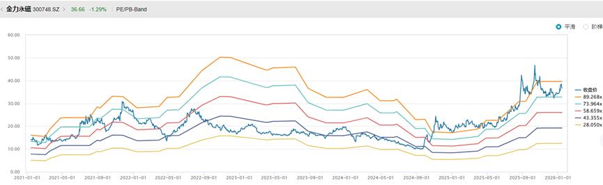 近五年,金力永磁市盈率在30倍至115倍区间宽幅波动,估值弹性显著。截至2026年1月21日,公司市盈率约为82倍左右,处于历史偏高水平,对应近250个交易日113.92%的股价涨幅,估值与股价形成同步抬升态势。