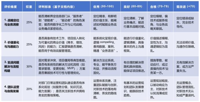 对企业HR和数字化分管领导的核心应用价值在于它改变了传统技术面试的局限,将数字化转型的核心挑战(如角色转变、价值量化、变革管理)转化为可分维度评估的关键胜任力指标。它不仅能高效筛选出兼具业务洞察与领导力的实战型人选,其问题框架本身也为统一招聘标准、诊断信息部门现状以及引导管理者共同思考如何提升数字化团队的战略价值,提供了可操作的行动框架,从而实现人才选拔与组织能力建设的双重目标。