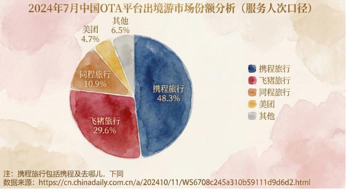 图4:数据显示携程(含去哪儿)在出境游市场占据48.3%的份额。尽管维持高毛利,但在美团“高频打低频”及抖音“内容即交易”的冲击下,平台正陷入流量焦虑与侧翼竞争。图片来源:AI生成