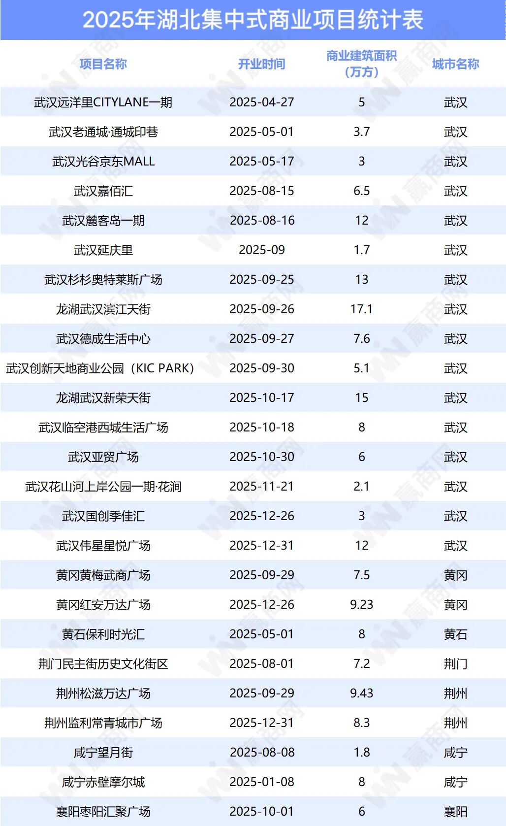 据不完全统计,2025年湖北新开25个集中式商业,商业总体量超186.25万平方米,其中3万平方米以上项目有22个,并呈现出“体量集中、一核多级、企业多元”的特征。