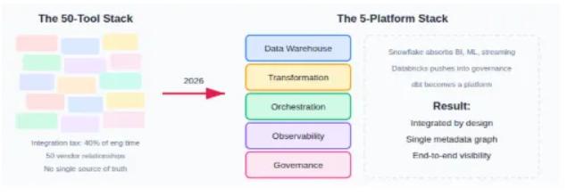 Snowflake整合了更多功能——笔记本、流媒体和机器学习服务。Databricks则在治理和商业智能领域深耕。dbtLabs从一款工具发展成为一个平台,拥有语义层和 dbt Cloud。而那些原本各自独立的解决方案要么被收购,要么难以保持市场地位。