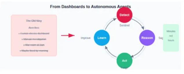 能够理解业务上下文而非仅仅关注技术指标的检测;能够自动追溯溯源、关联跨系统信号的调查;能够应用修复方案、验证结果并从每次事件中吸取经验教训的解决机制。