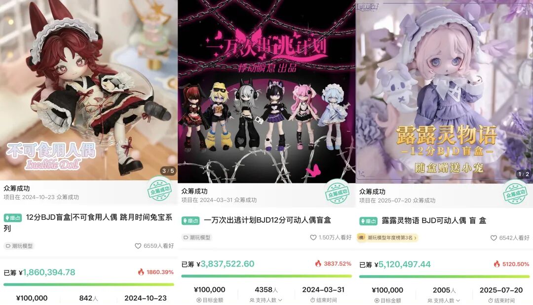 2024年、2025年,市场就爆出不下10个百万级可动人偶类众筹项目。初创团队众筹项目“糖指数100%”,很快就达成800万众筹额。有统计,赛道内不下50+工作室/品牌,既有成品销售,也有素体、素头这类部件定制类。