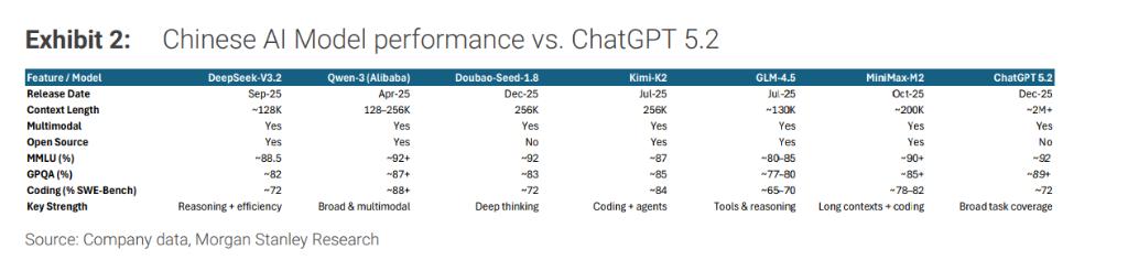 摩根士丹利的数据显示,尽管在先进算力、硬件获取和训练规模上受到限制,中国领先的AI模型在过去两年中迅速缩窄了与全球前沿模型(如ChatGPT 5.2)的性能差距。DeepSeek V3.2在标准化基准测试中表现优异,其MMLU得分约为88.5%,编码能力(SWE-Bench)约为72%,在推理和效率方面展现出强大竞争力。