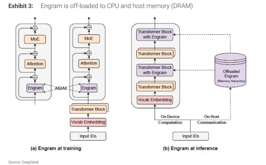 大摩分析师在报告中强调:“DeepSeek将‘条件记忆’与计算分离,为大语言模型(LLM)解锁了新的效率水平。Engram是一种在不通过重载HBM的情况下,高效‘查找’基本信息的方法,从而释放容量用于更复杂的推理任务。”