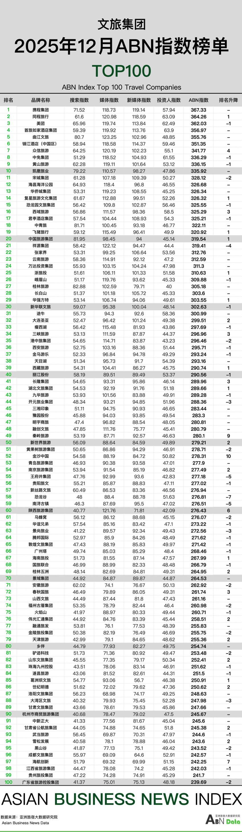 综述|2025年12月,文旅企业的媒体指数和新媒体指数稳中略升,监测均分达到118.8,118.12,投资人指数保持平稳。