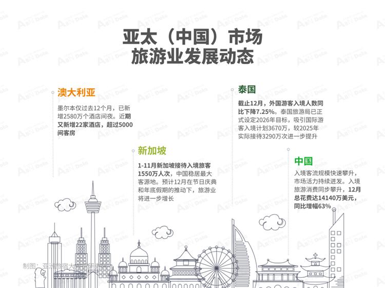 中国方面,海南自贸港全岛封关运作首月,入境旅游市场政策红利加速释放、实现“开门红”。入境旅游市场呈现的三大变化:入境客流规模快速攀升,市场活力持续迸发。2025年12月,海南接待入境过夜游客达77.3万人夜,较2024年增长59.5%,入境旅游市场全面超越疫情前水平。俄罗斯、东南亚及港澳台地区等传统客源市场稳定增长,欧美、澳新等远程市场同样表现亮眼。其中,英国、法国、意大利、西班牙、澳大利亚等国家2025年12月游客量同比增长分别为56%、83%、144%、62%、52%。旅游消费形态加速升级,深度度假特征凸显。入境旅游消费同步攀升,2025年12月总花费达14140万美元,同比增幅63%。离岛免税购物热度不减,化妆品、国货精品等品类备受青睐,消费重心正从单一购物向深度体验转型。同时,入境游客停留时间明显延长,人均停留夜数由2024年的3.37夜提升至今年的3.96夜,深度度假特征更加突出,彰显了海南高品质度假旅游的独特魅力和综合竞争力。全岛封关运作首月,海南入境旅游市场在规模、结构和质量上均呈现出积极而深刻的变化,实现了良好开局。