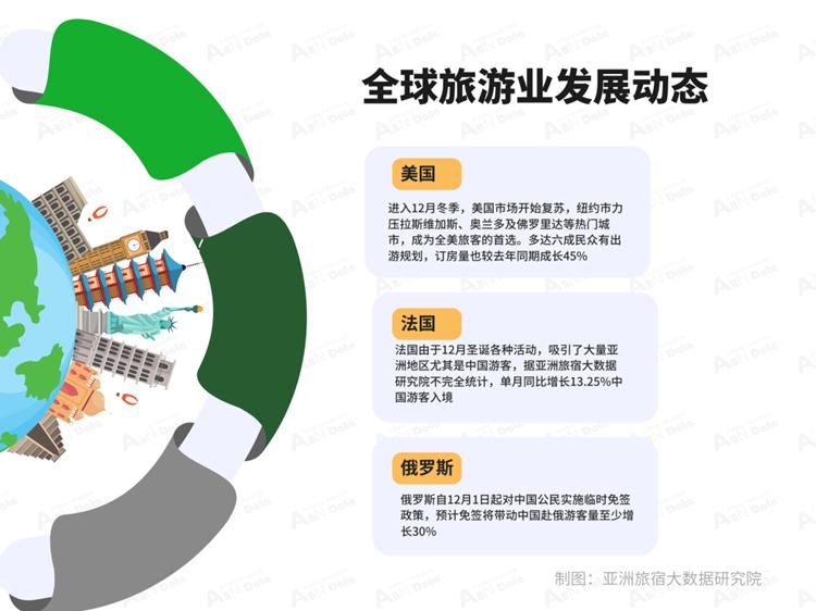 法国方面,12月2日至3日,一波协调发布的消息显示,俄罗斯、法国、意大利、西班牙、澳大利亚、新西兰、日本和韩国八大主要旅游市场,现已对持中国护照者开放30天免签入境。尽管部分免签政策此前已启动,此次联合宣布凸显各国政府正迅速行动,抢占中国长途出境旅游反弹的先机。欧洲旅游局预计,此举将延长游客行程,提升奢侈品购物和高端餐饮等高消费领域的收入。法国由于12月圣诞各种活动,吸引了大量亚洲地区尤其是中国游客,据亚洲旅宿大数据研究院不完全统计,单月同比增长13.25%中国游客入境。