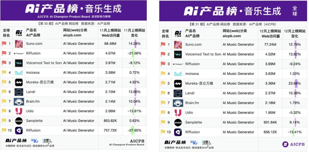 根据AI产品榜的统计数据,在AI音乐生成领域,近两个月(2025年11月和12月)Mureka的访问量都排在第五,排名不错,但头部Suno的访问量是Mureka的20多倍,是第二名的10多倍。
