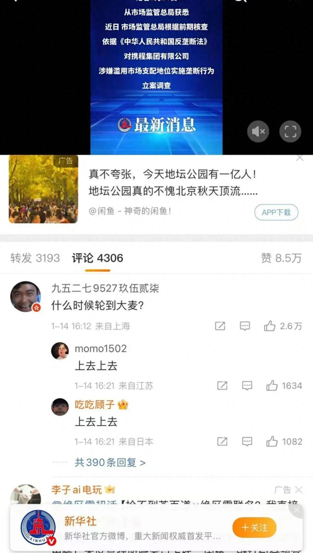 在新华社发布携程被查的微博下,有网友表示,“什么时候轮到大麦?”