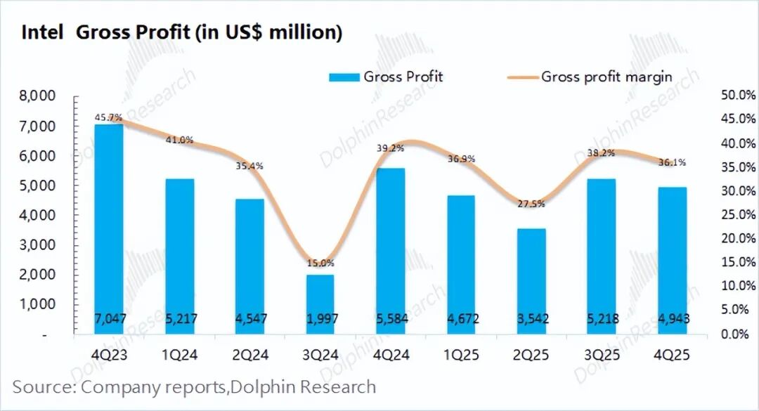 1.2毛利及毛利率:英特尔在2025年第四季度实现毛利49亿美元,环比下滑5%,主要是受毛利率下降的影响。