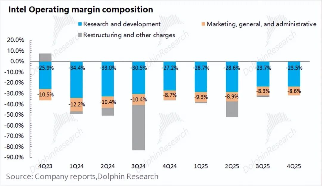 1.3经营费用端:英特尔在2025年第四季度经营费用为43.6亿美元,同比下滑15.6%。公司新任CEO定下“削减成本开支”的目标后,经营费用也是一个关注点。