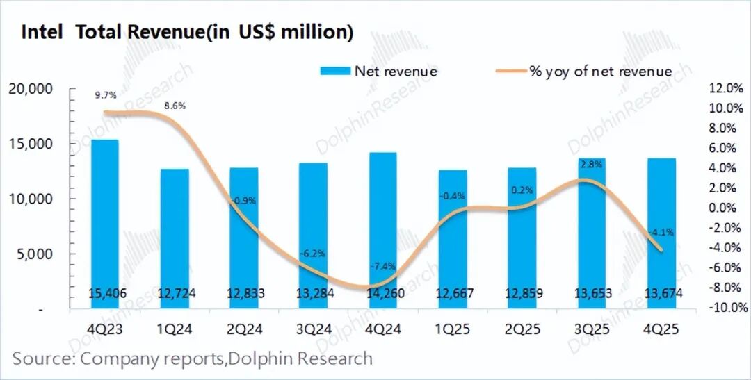 英特尔于北京时间2026年1月23日上午的美股盘后发布了2025年第四季度财报(截止2025年12月),要点如下: