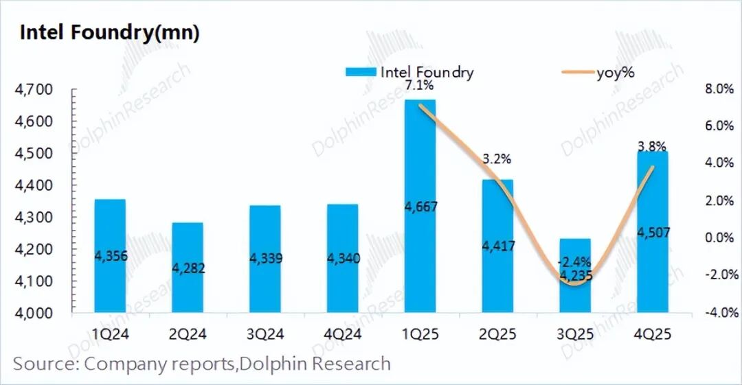 英特尔的晶圆代工业务收入在2025年第四季度实现45亿美元,同比增长4%。结合公司本季度的各业务内部的抵消总额也有43.4亿美元,可以看出公司当前的晶圆代工基本都是对内服务,对外代工收入极少。