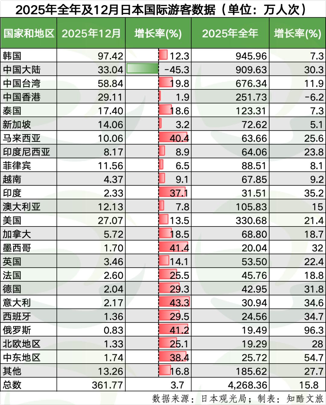 12 月,日本几乎所有的客源国、客源地都在增长,唯有中国大陆暴降45.3%,清晰地显示出中国旅游制裁的压力感。全年数据,由于此前中国大陆赴日游的高增长,2025年全年赴日游909万人次,同比增长30.3%。日本2025年总计接待国际游客4268万人次,刷新历史新高。