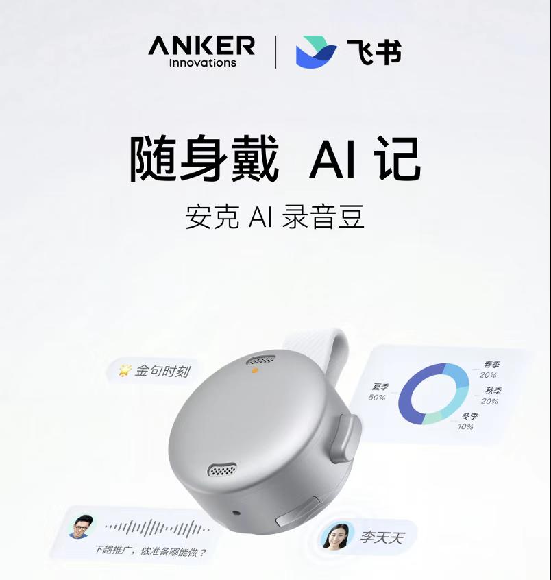 就在1月19日,安克创新与字节跳动旗下飞书联合发布最新AI硬件——安克AI录音豆。合作关系上,安克创新负责硬件端研发,飞书提供软件AI适配与服务,更多侧重软件、AI 能力支持,以及开放接口,使设备录音可直接接入飞书体系,自动将录音文件导入飞书生态,并沉淀为飞书文档。