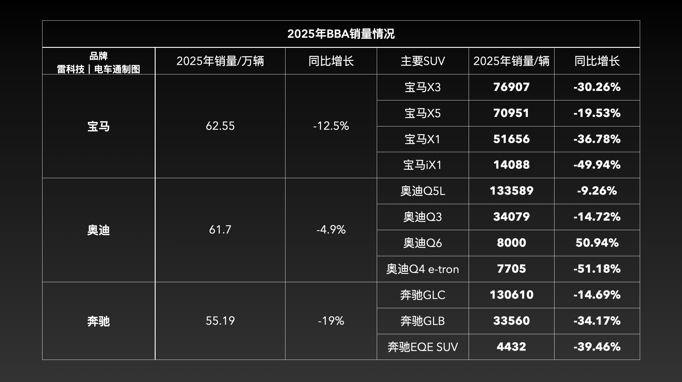 为什么BBA突然失速了?电车通经过分析后发现,导致它们整体失速的核心,恰恰出在SUV细分市场,旗下卖得最好的SUV几乎都「扑街」了。