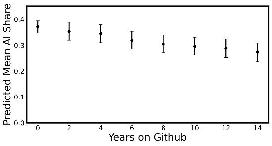 图|美国 GitHub 用户创建或大幅修改的 Python 函数占比。垂直线表示 95% 置信区间,该图表揭示了人工智能关键事件时间点与使用情况突变的对应关系。
