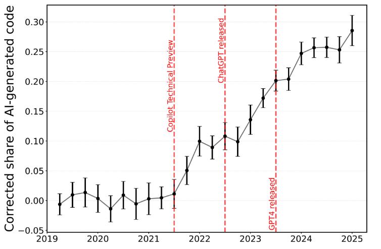 研究发现,截至 2024 年底,美国已有约 29% 的 Python 函数被标记为 AI 生成或辅助完成。这一比例并非匀速上升,在 GitHub Copilot 预览版推出、ChatGPT 公开上线,以及 GPT-4 等大模型发布这几个关键节点后,AI 生成代码的占比都出现了陡峭的跃升。