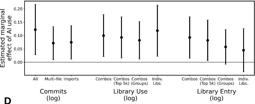 研究证实,生成式 AI 确实提升了整个行业的输出效率。据模型估计,当 AI 生成代码的比例从 0 提升至29%(即 2024 年底的美国采用率)时,开发者每季度的代码提交量平均增加了 3.6%。
