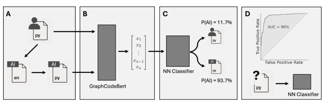 为此,研究团队创新性地训练了一个神经分类器。该分类器通过 GraphCodeBert 模型深入理解代码的数据流和结构,并在一套精心构建的训练集上学习。该训练集既包含纯人类编写的代码,也包含由不同大语言模型(LLM)接力生成的合成代码,从而能有效区分二者的细微差异。