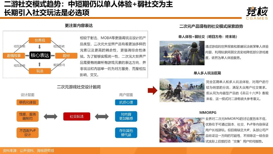 二次元游戏在设计与用户层面均面临一定的社交设计困局,设计层面以单机化体验为主,不匹配PvP设计,且设计资源受性能优化、服务器制约;用户层面,部分核心二次元用户对内容更加敏感,对陌生人、大规模社交存在抗拒心理。