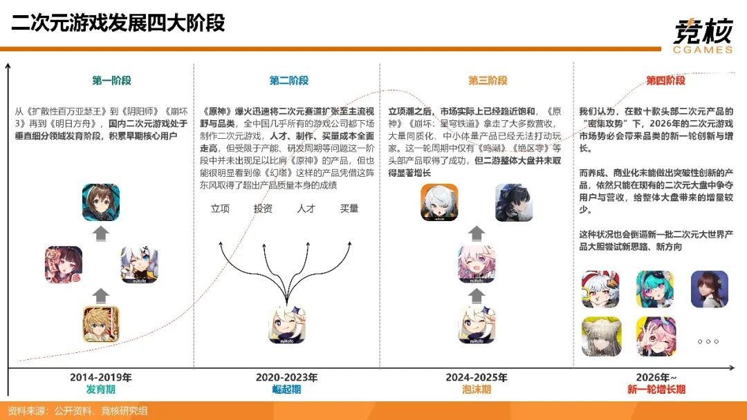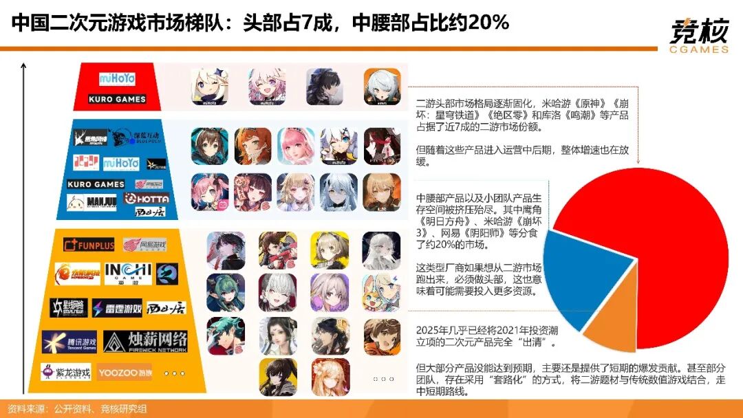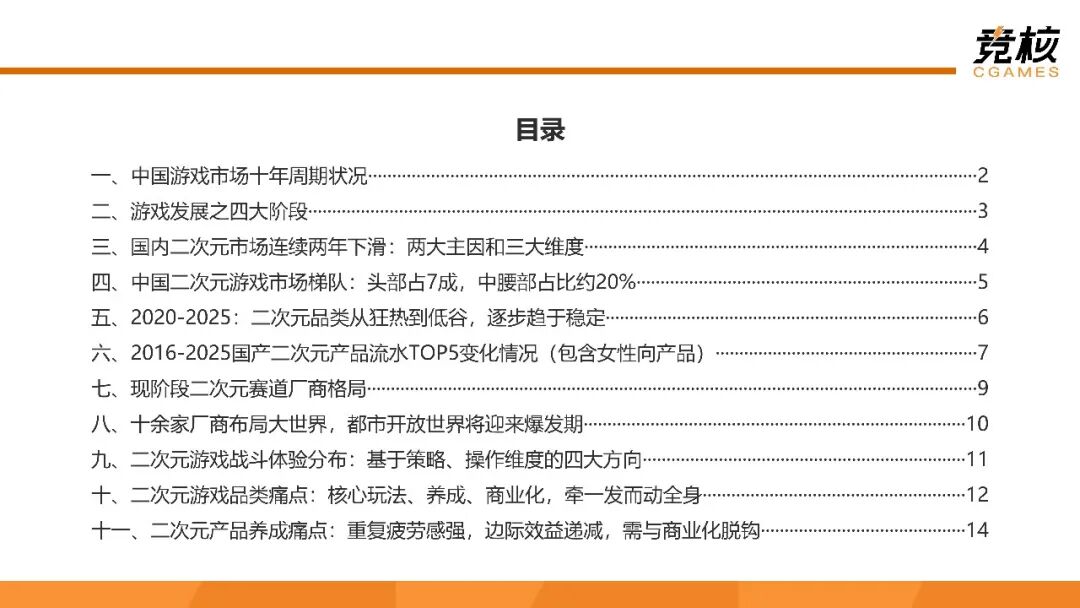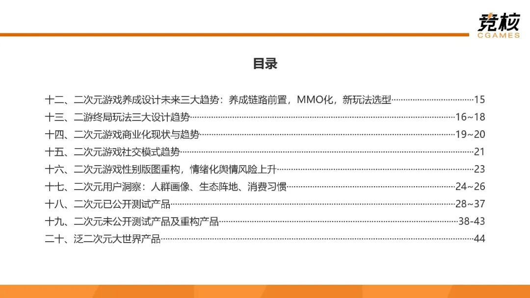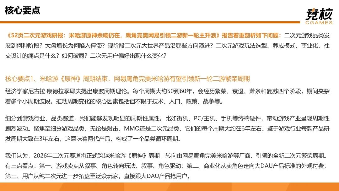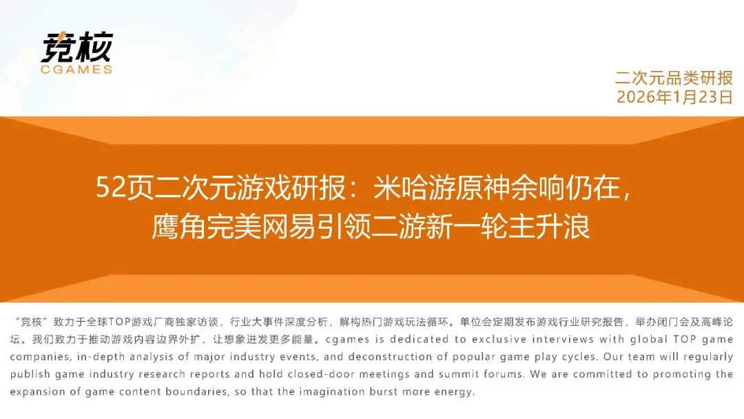 《52页二次元游戏研报:米哈游原神余响仍在,鹰角完美网易引领二游新一轮主升浪》报告着重剖析如下问题:二次元游戏品类发展到何种阶段?大盘增长为何陷入停滞?现阶段二次元大世界产品沿哪些方向演进?二次元游戏玩法选型、养成模式、商业化、社交设计的痛点是什么?如何破局?二次元用户偏好出现什么变化?