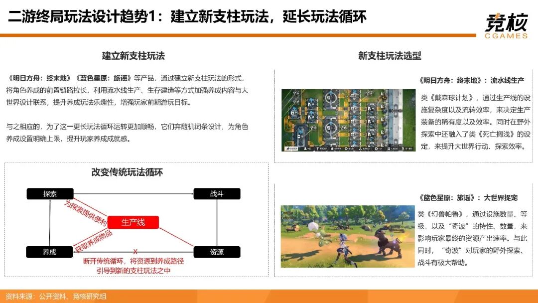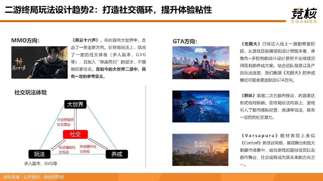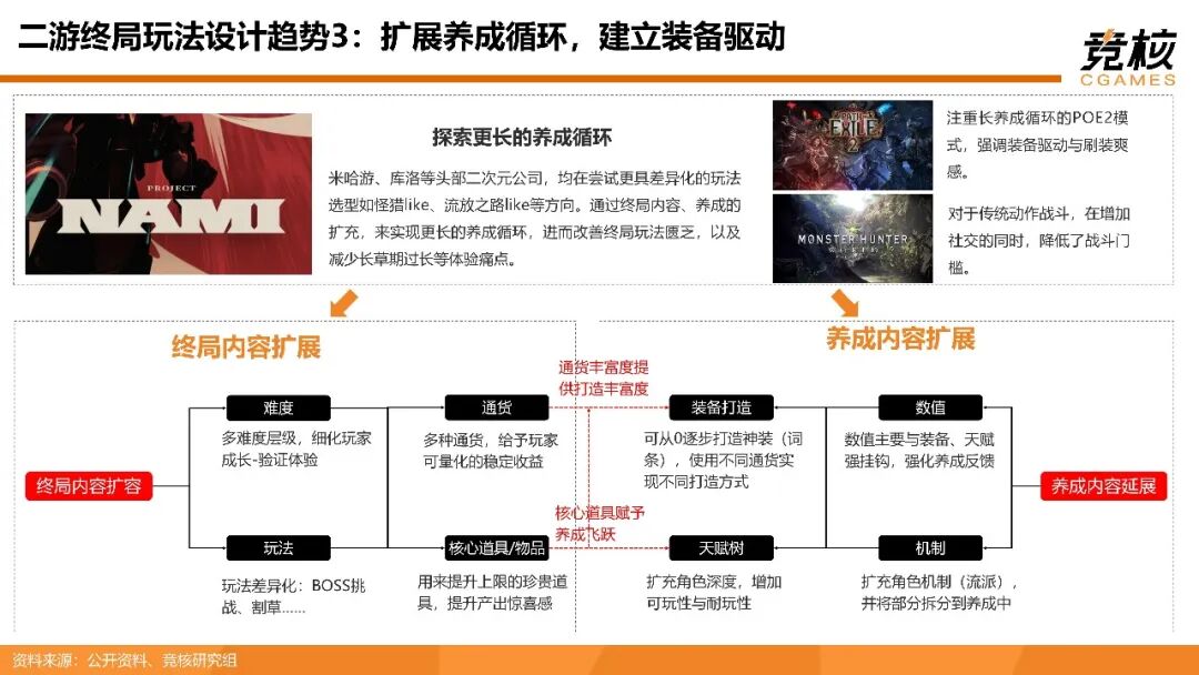 它已逐步显露出三大发展趋势:一、建立新支柱玩法,延长玩法循环。拉长角色养成前置链路,加强养成内容与大世界设计联系;二、打造社交循环,提升体验粘性,向MMORPG、GTA都市开放世界方向发展;三、扩展养成循环,建立装备驱动,向怪猎like、流放之路like方向演进。