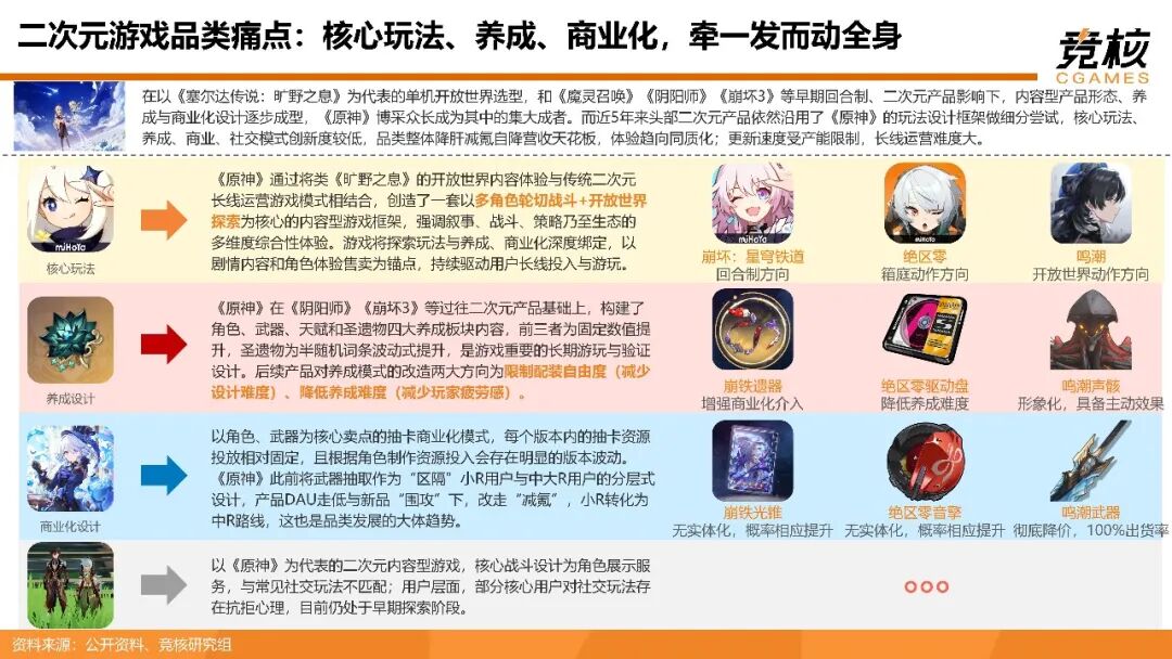 在以《塞尔达传说:旷野之息》为代表的单机开放世界选型,和《魔灵召唤》《阴阳师》《崩坏3》等早期回合制、二次元产品影响下,内容型产品形态、养成与商业化设计逐步成型,《原神》博采众长成为其中的集大成者。