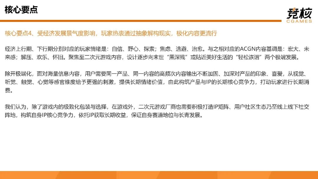 经济上行期、下行期分别对应的玩家情绪是:自信、野心、探索;焦虑、逃避、治愈。与之相对应的ACGN内容基调是:宏大、未来感;解压、欢乐、怀旧。聚焦至二次元游戏内容,设计逐步向末世“黑深残”或贴近美好生活的“轻松诙谐”两个极端发展。