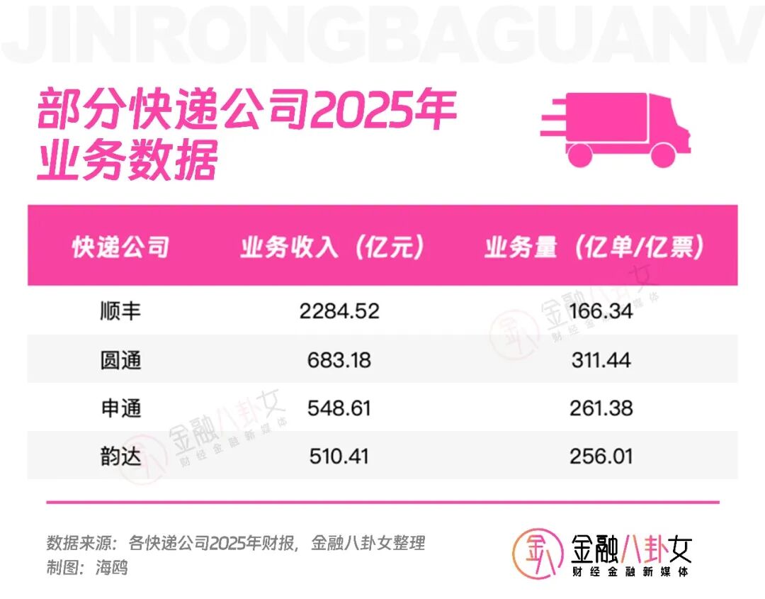 从数据也能看出格局变化。2025年全年,顺丰物流业务收入2284.52亿元,完成业务量166.34亿票;圆通营收683.18亿元,业务量311.44亿单;申通营收548.61亿元,业务量261.38亿单;韵达营收510.41亿元,业务量256.01亿单。规模还在,但差距已经拉开。