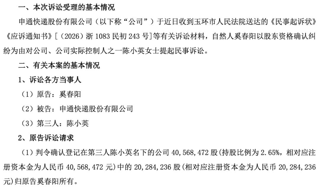 而奚春阳的诉求也相当明确——他认为,登记在陈小英名下的4056.85万股申通股份,属于双方离婚时约定分割的特定夫妻共同财产,上市只是形式变化,并不影响其一半归属,因此请求确认其中2028.42万股的股东资格,并要求协助办理非交易过户。