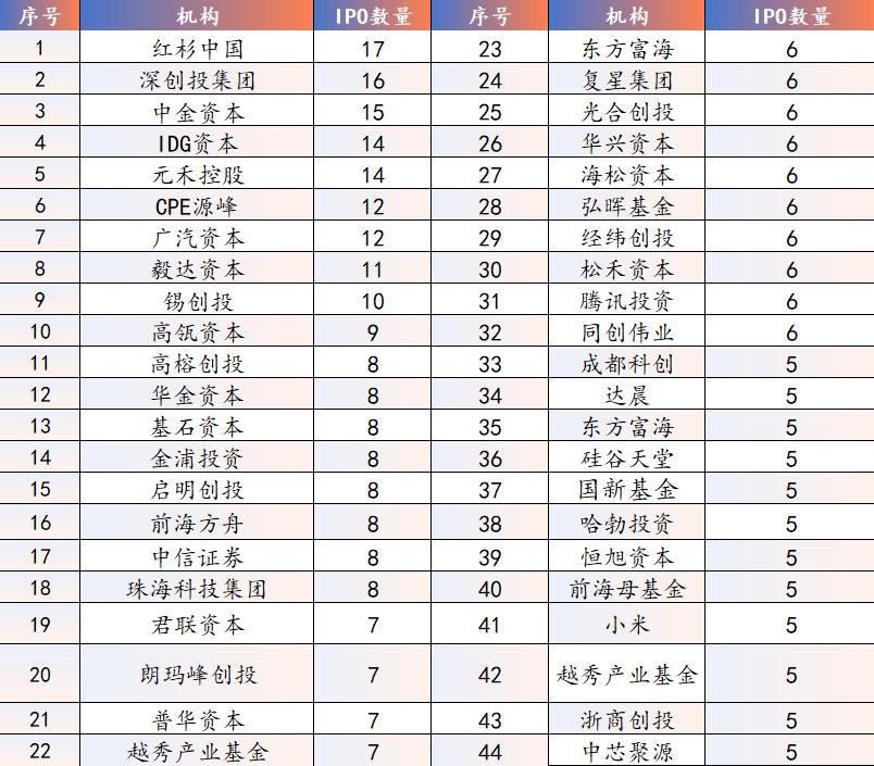 除此之外,IDG资本、元禾控股、CPE源峰、广汽资本、毅达资本、锡创投、高瓴资本跻身IPO数量前十之列。
