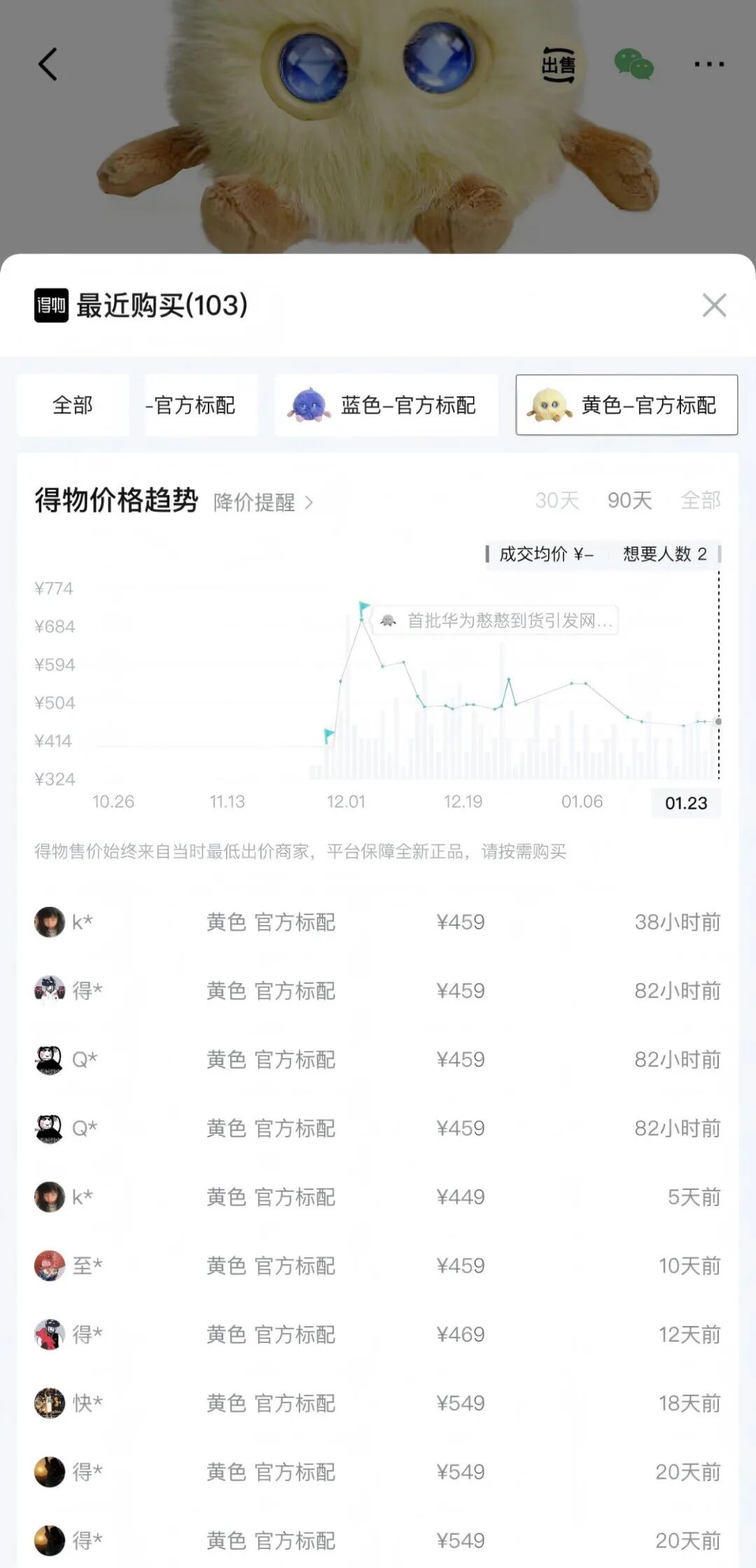 第三方平台得物App显示,2025年12月3日,黄色款“智能憨憨”成交价最高上涨至699元,溢价一度高达300元,溢价幅度75%,但仍一货难求。随着华为多次补货,“智能憨憨”的市场价有所回落,降至500元以下。