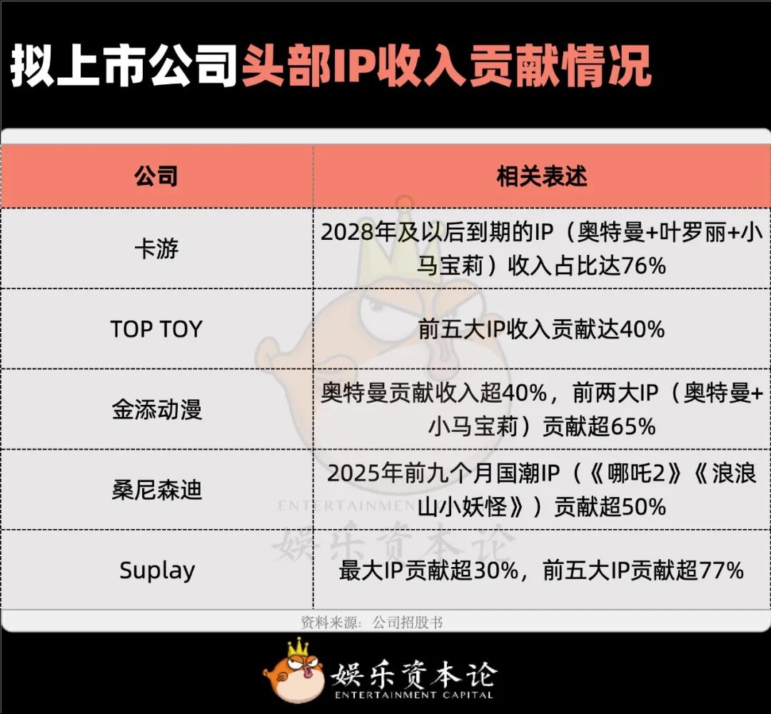 小娱从大IP依赖和续约安排两方面分析这一问题。从递表的六家公司来看,两家潮玩集合品牌中,乐自天成未披露头部IP贡献比例,TOP TOY头部IP贡献相对小于其他公司;而卡游、金添动漫都展示出对奥特曼和小马宝莉IP的极大依赖。正如小娱此前提到,“中国资本市场没有谷子经济,只有奥特曼经济。”