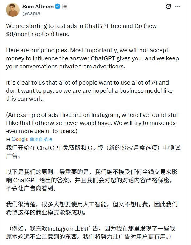这表明,OpenAI 的当务之急并非“卖广告”,而是先弄清楚广告在ChatGPT等产品中应如何在技术层面运作。