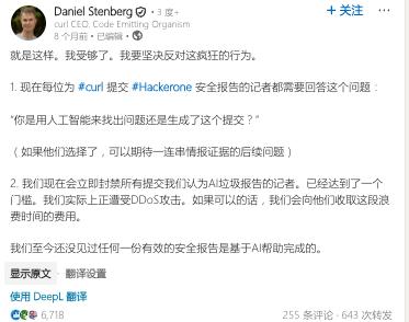2025 年 5 月,因为 AI 生成的漏洞报告泛滥,Stenberg 在 Linkedln 上发帖称:“我受够了......我们实际上正在遭受 DDoS 攻击......”