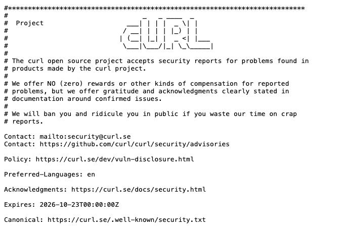 同时,curl 团队也在官方的“Security.txt” 文件中,语气更为强硬地写道:“如果有人用毫无价值的报告浪费我们的时间,我们会封禁其账号,并公开点名嘲讽。”