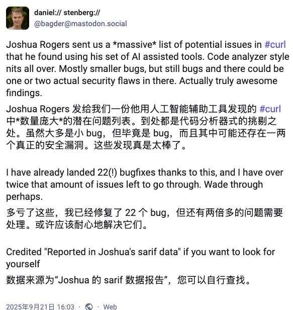 去年 9 月,他曾公开表扬一位研究人员——对方借助一系列 AI 工具,提交了一份详尽的漏洞清单,最终帮助 curl 团队修复了 22 个漏洞。
