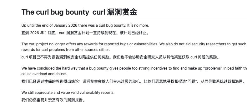 「BUG-BOUNTY.md:我们将于 2026 年 1 月底停止漏洞赏金计划」