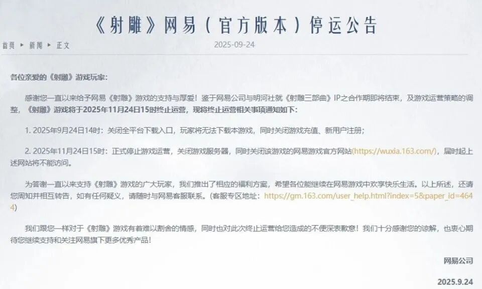 网易宣布《射雕》停运