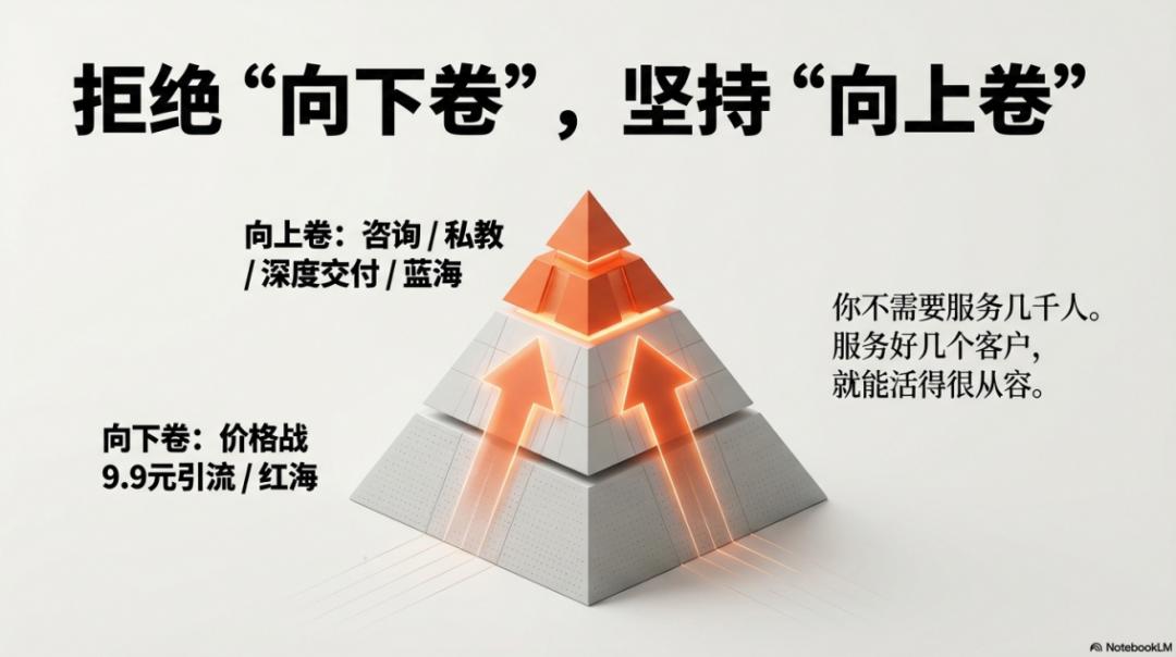 不要去做9.9元的引流课,不要去搞那些廉价的流量。直接做高客单价的产品,比如咨询、陪跑、私教 。