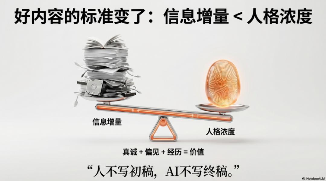 AI可以高效完成预完成稿、脚本、知识库整理,但最终的内容必须有人味。人味的特点,就是不完美,这就是你与AI的本质区别。