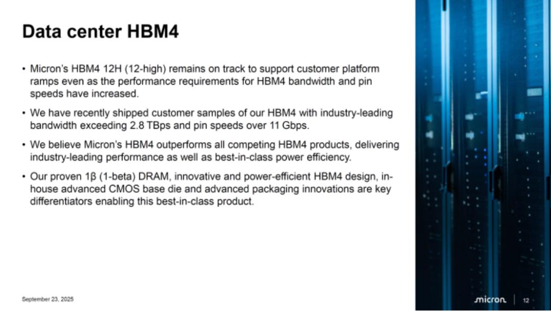 美光CEO桑杰·梅赫罗特拉在2025财年第四季度及全年财报中证实,公司新一代HBM4内存将于2026年推出,多项性能指标超越JEDEC基础规范。