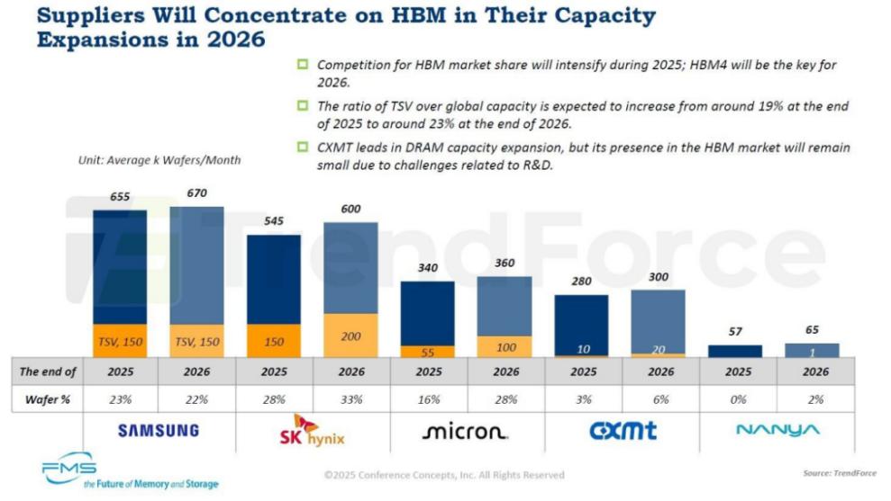 主要DRAM供应商的DRAM晶圆加工能力(月产量,单位:千片)和TSV工艺晶圆加工能力(月产量,单位:千片)。所有数据截至年底。来源:2025年FMS会议论文集,TrendForce